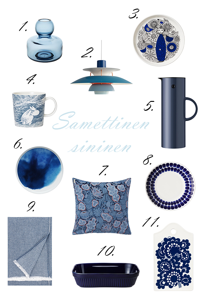 1. Marimekko, Flower maljakko, tummansininen. | 2. Louis Poulsen, PH 5 riippuvalaisin, sininen. | 3. Arabia, Pastoraali lautanen 19 cm. | 4. Arabia, Muumi muki, Lumituisku. | 5. Stelton, EM77 termoskannu 1,0 L, tummansininen. | 6. Marimekko, Oiva - Sääpäiväkirja lautanen 25 cm. | 7. Klaus Haapaniemi, Iceflower tyynynpäällinen, sametti, sininen. | 8. Arabia, 24h Tuokio lautanen 20 cm. | 9. Lapuan Kankurit, Maija torkkupeitto, valkoinen - mustikka. | 10. Arabia, Uunikokki lasagnevuoka 2,5L, yönsininen. | 11. Arabia, Esteri tarjoilualusta.